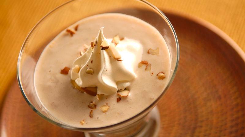- Place all ingredients except whipped cream topping and chopped almonds in blender. Cover and blend on medium speed, about 45 seconds or until well combined. Pour into glasses. Garnish with whipped cream topping and chopped almonds. Serve immediately.