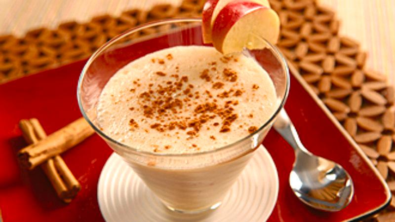 - Place all ingredients except additional cinnamon and apple slices in a blender. Cover and blend until smooth. Pour into glasses; sprinkle with cinnamon and garnish glass with apple slices. Serve immediately.