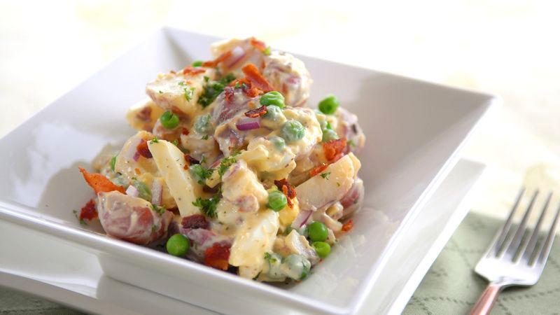 - In a medium bowl, stir together yoghurt, maple syrup, salt, and pepper. Mix well and set aside. In a large bowl, toss together potatoes, eggs, peas, bacon, and onion. Pour the yoghurt mixture over the potato mixture and mix well.