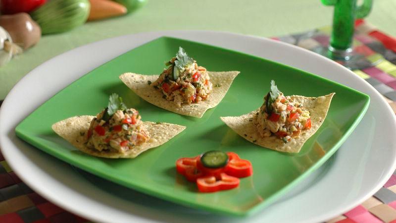 - Toss avocado in lime juice. Gently fold into chicken mixture. Add a dash of chipotle chili powder to add a smoky heat. Mound mixture on tortilla chips and serve.