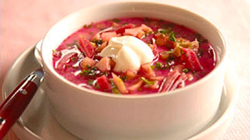 - Whisk chicken broth, yoghurt, sugar, and salt with beet juice. Stir in cucumber, green onions and beets. Cover and chill for one hour. Spoon into chilled bowls; garnish with a dollop of plain yoghurt and sprinkle with parsley.