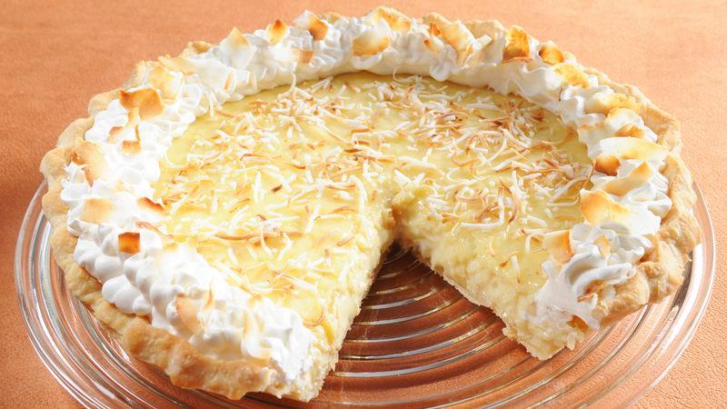 - Spread mixture into cooled pie crust. Cover with plastic wrap, placing plastic wrap directly on surface of custard. Refrigerate 3 to 4 hours or until thoroughly chilled. Garnish with whipped cream and remaining coconut flakes.