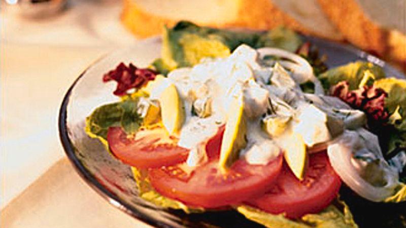 - Cover and chill 2 hours to blend flavors. Spoon over lettuce, tomato, and avocado arranged on a platter or individual plates. Cover and refrigerate any leftover dressing.