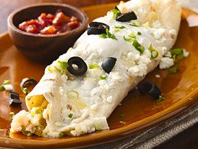 - Divide Monterey Jack cheese, shrimp, crabmeat and all but 1 tablespoon green onions (reserve remaining tablespoon of onions for garnish) between tortillas; roll up and place seam side down in baking dish.