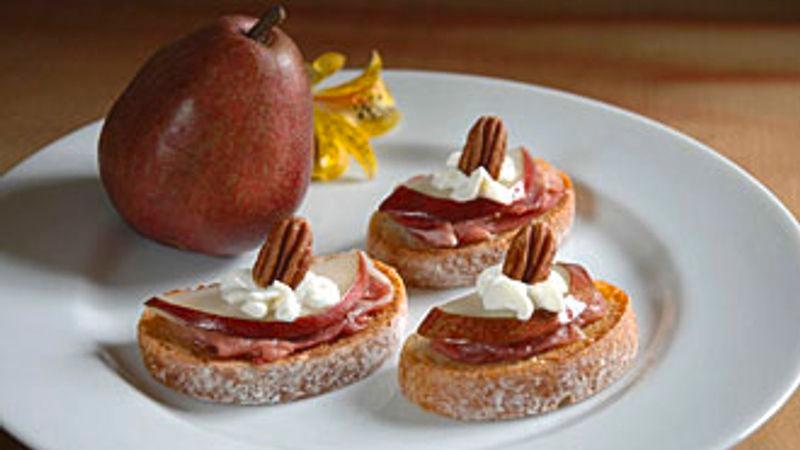 - To make the crostini, place a slice of prosciutto on each toast slice and top with a pear slice. Put a dollop of sweet cream on top of each pear. Garnish each crostini with a pecan half.