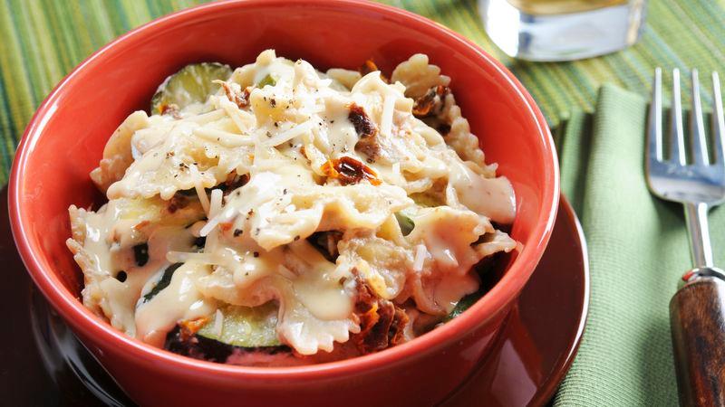 - Return the farfalle and zucchini to the pasta pot and add the sun-dried tomatoes, reserved pasta water, and yoghurt sauce. Cook over low heat, tossing mixture until the sauce coats the pasta and mixture is warm throughout. Transfer to warmed bowls and serve with the extra cheese sprinkled on top, if desired.