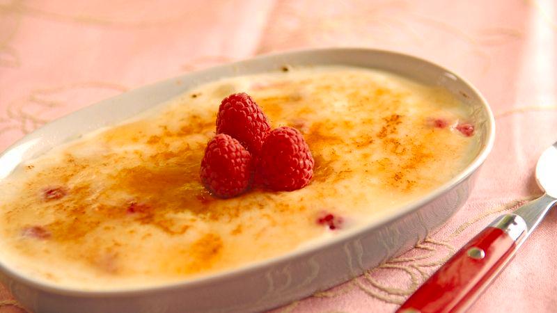 - Distribute the raspberries evenly among four flat crème brûlée or custard dishes. Spoon the yoghurt over the raspberries and smooth to cover. Sprinkle the sugar evenly over the yoghurt in the four dishes.