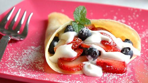 - To assemble crepes, lay a crepe out on a plate, drizzle with a little sauce, and place 2 to 3 tablespoons of berries in a line in the center. Fold crepe over berries and roll up crepe. Top with a dollop of the cream sauce. Repeat with remaining crepes.