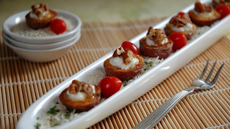 - While potatoes are baking, in a small bowl, combine yoghurt cheese and gorgonzola. Mix well. Spoon cheese mixture into baked potato halves, distributing evenly. Sprinkle pecans on top of stuffed potatoes. Return baking sheet to oven and continue baking at 350°F for about 15 minutes until potato edges begin to crisp.