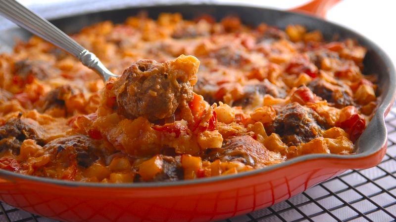- Grease a large baking dish or oven-proof skillet with cooking spray and add the meat balls.