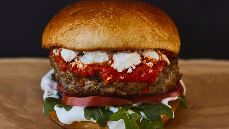 - Place patties on buns; top with feta cheese, tomato and arugula. Serve with harissa and additional yoghurt.