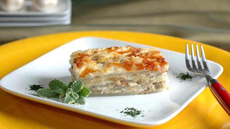 - Butter a 13x9-inch baking dish and coat the sides and bottom with 1/2 cup of the bread crumbs. Arrange a layer of potatoes in the bottom of the dish. Spread 1/4 of the mushroom mixture over the potatoes. Repeat layers three more times with remaining potatoes and mushroom mixture.