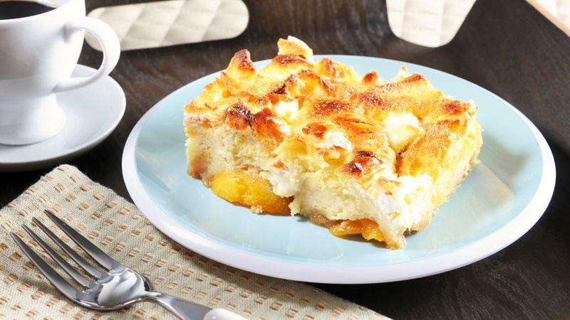 - Place 1/2 of the bread cubes in the bottom of a greased 9x13-inch glass baking dish. Top with 1/2 of the sugared peaches. Evenly place the cubes of cream cheese over the bread and peaches. Top with remaining bread cubes. Top with remaining peaches, distributing them evenly among the bread cubes. Press down gently. Pour egg mixture over the peaches in the dish, evenly distributing the liquid over the entire pan. Cover and refrigerate overnight.
