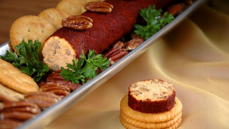 - On a plastic cutting board, roll mixture into a log. Place atop a sheet of plastic wrap. Dust outside of roll with paprika, rolling to coat evenly. Tightly wrap in plastic and refrigerate for several hours. Serve with crackers and apple slices.