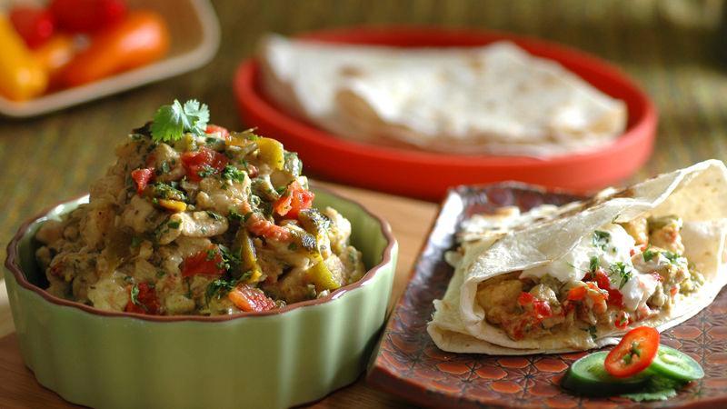 - Add garlic, jalapeno, tomatoes, chili powder, salt, and roasted peppers. Cook for about 3 minutes to heat through. Stir in yoghurt and pepper jack cheese. Mix well and continue heating for one more minute or until cheese is melted. Remove from heat and serve with in warm flour tortillas.