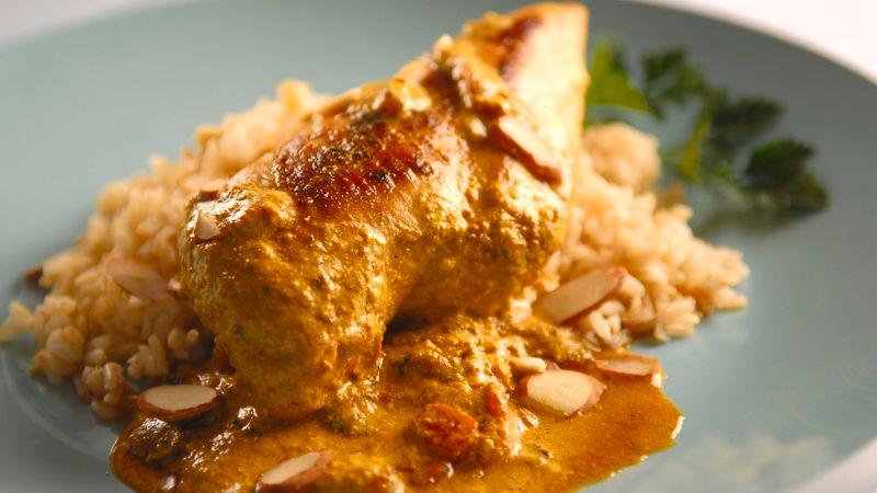 - Add yoghurt mixture to skillet, reduce heat to low, and cook for about 20 minutes, or until juice of chicken is clear when thickest part is cut to bone (at least 165°F). To serve, spoon rice into a large, deep serving plate. Top with chicken; pour sauce on top (discarding cloves, cardamom pods, and cinnamon sticks). Garnish with almonds.