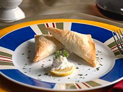 - Place 1 tablespoon cheese mixture on end of 1 strip. Fold strip over cheese mixture, end over end in triangular shape, to opposite end. Place on seam-side down on greased cookie sheet. Repeat with remaining strips and cheese