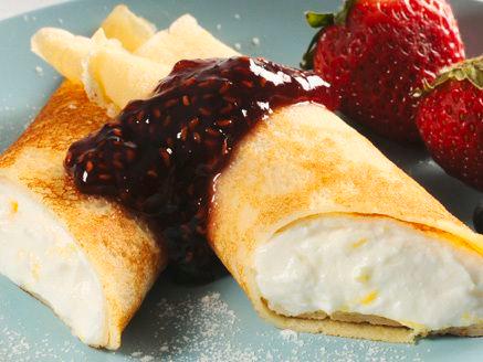 These filled pancakes make a lovely breakfast for guests. Yoghurt Cheese can be easily made by straining our regular yoghurt overnight. Melting the preserves makes it easier to distribute them over the finished pancakes.
