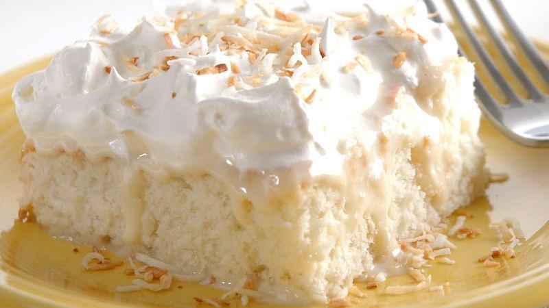 - Make, bake and cool cake mix as directed on package for a 13x9-inch cake. Cool 5 mintues. Poke top of hot cake every 1/2 inch with long-tined fork, wiping fork occasionally to reduce sticking.