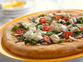 - Meanwhile, in a 10-inch skillet, heat olive oil over medium heat. Add mushrooms and garlic. Cook for about 4 minutes and remove from heat. Toss in greens and turn with a spatula until greens wilt slightly, about 1 minute. Transfer warm ingredients directly onto hot pizza crust. Top with dollops of yoghurt cheese, tomatoes, and parmesan. Heat under a broiler for 2 or 3 minutes until cheese melts. Serve immediately.