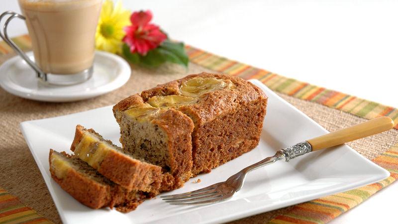 - Pour batter into a 9x5-inch greased and floured loaf pan. Bake at 350°F for 50 to 60 minutes until golden brown and a toothpick inserted into center comes out clean. Cool in pan 10 minutes on cooling rack.
