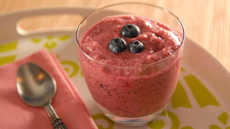 - Place all ingredients except fresh blueberries in a blender. Cover and blend until smooth. Serve immediately.
