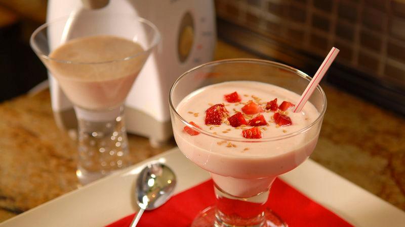 - Place all ingredients in blender except chopped strawberries. Cover and blend on low speed until smooth. Pour into glass; garnish with chopped strawberries. Serve immediately.