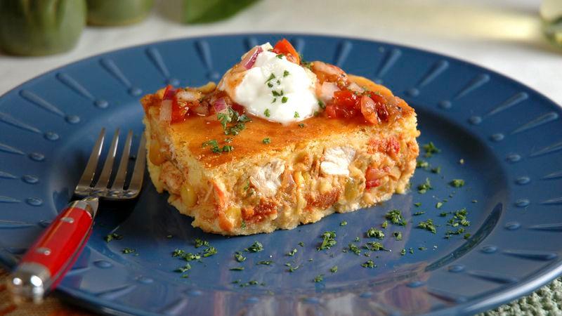 - Spray a 9x13-inch baking dish with cooking spray. Spread half of the cornbread batter evenly in the bottom of the pan. Spoon chicken mixture evenly over batter. Drop the remaining cornbread batter by spoonfuls onto chicken mixture; spread evenly.