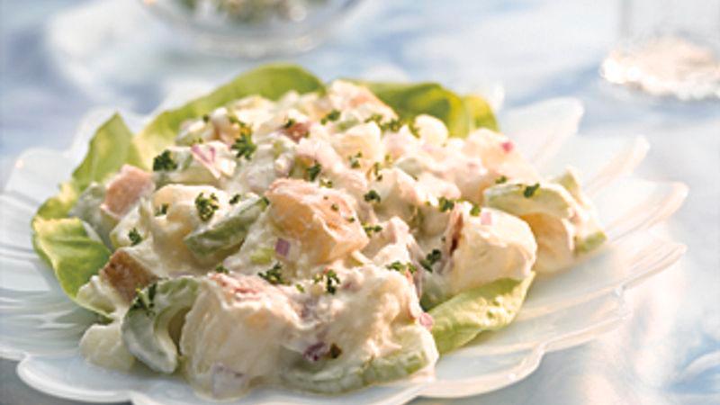 - In Dutch oven or 5-quart saucepan, place potatoes and 1/2 teaspoon salt. Add water just to cover. Heat to boiling; reduce heat to low. Cover; simmer 20 minutes or until tender. Drain; rinse with cold water to cool. Drain well. Cut into 1-inch pieces.