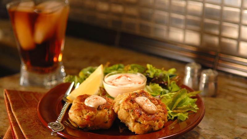 - In 12-inch nonstick skillet, heat oil over medium heat. Cook patties in oil about 10 minutes, gently turning once, until golden brown and hot in center. Reduce heat if crab cakes become brown too quickly. Serve crab cakes with Chili Sauce.