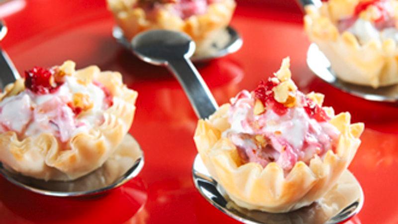 - Place one tablespoon of the cranberry mixture into each phyllo cup. Garnish with additional cranberry relish and pecans.
