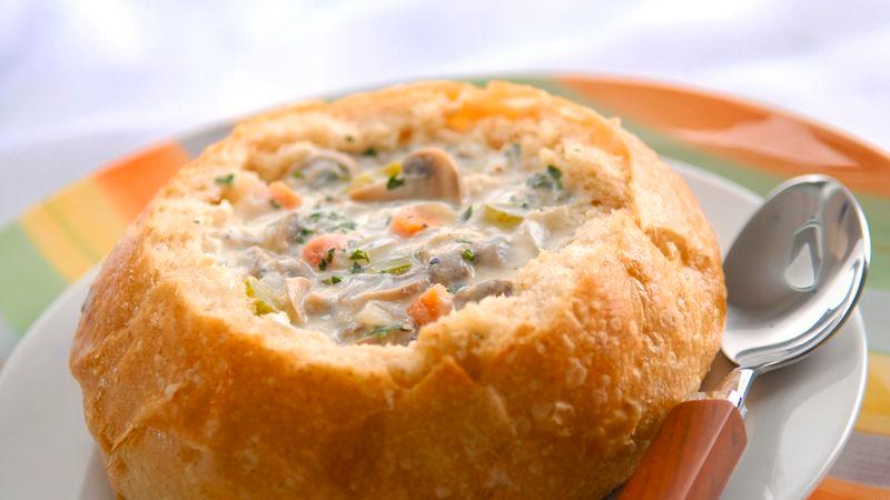 A great way to get your veggie servings in! To serve in a bread bowls, cut off tops from large (about 3 1/2 inches in diameter). Remove bread from inside of each roll, leaving 1/2-inch shell on side and bottom.