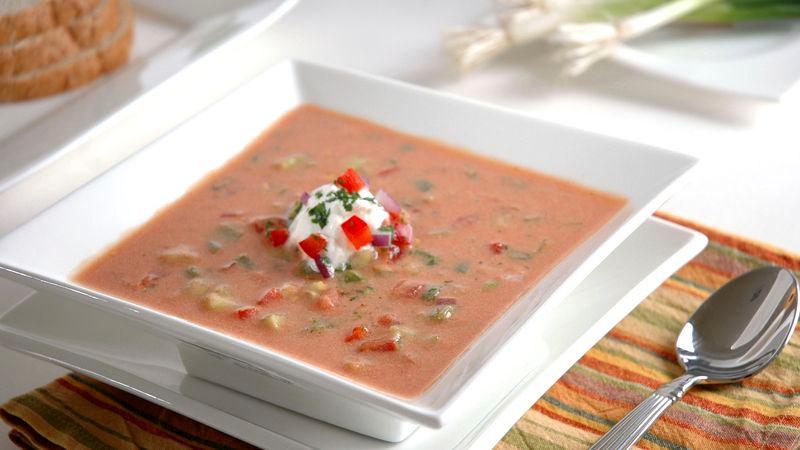 Hold the blender! This gazpacho is whipped up nice and easy with a whisk. Serve chilled, on a lazy summer afternoon under blue, blue skies.