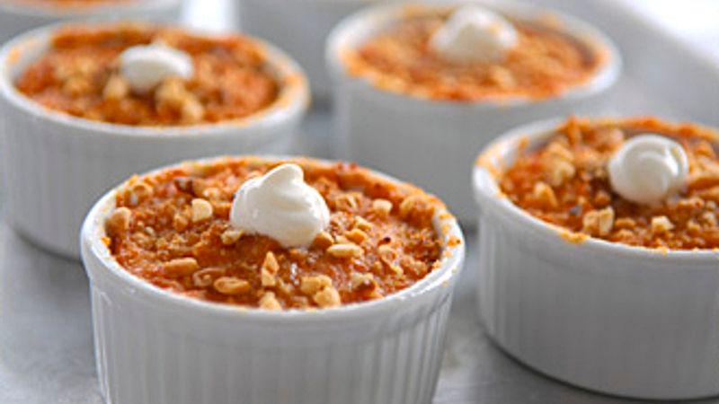 - In a small bowl, mix the 1 tablespoon brown sugar and the bread crumbs. Sprinkle over potato mixture. Bake ramekins at 400°F until tops are golden brown, about 20 minutes. Remove from oven and garnish with a dollop of yoghurt and sprinkle with pecans.