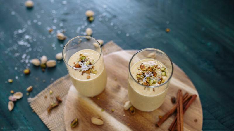 - Pour into 4 glasses; top with pistachio nuts and salt. Serve immediately.