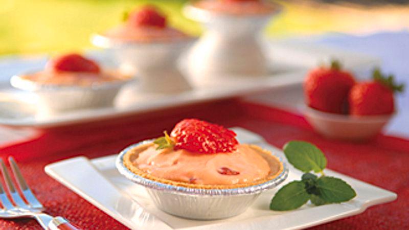 - In a large bowl, mix yoghurt, vanilla, and cherry-flavored gelatin. Whisk in instant pudding; stir in chopped strawberries. Pour mixture into graham cracker crusts. Cover and chill for about 30 minutes or until set. Garnish each tart with whipped topping and a strawberry half.