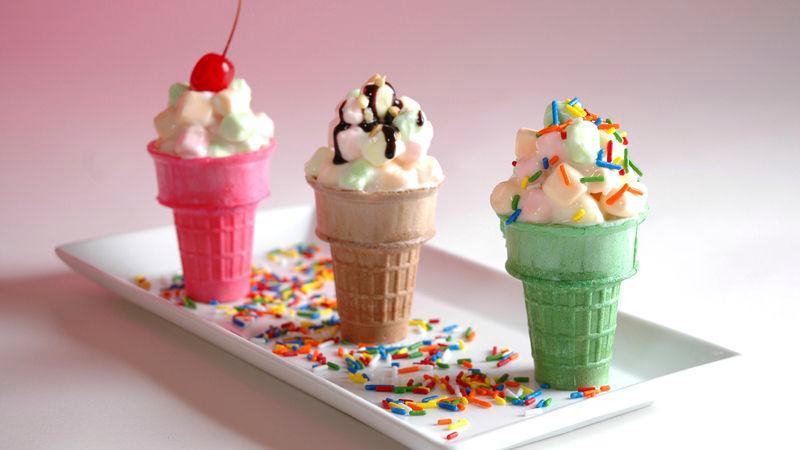 - Combine marshmallows and yoghurt in a medium bowl. Mix well. Spoon into ice cream cones. Garnish with your favorite toppings.