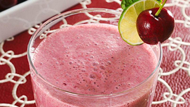 - Place all ingredients except whole cherries, lime slices and mint leaves in blender. Cover and blend on medium until smooth. Pour into glasses. Garnish with fresh cherries, lime slices and mint.