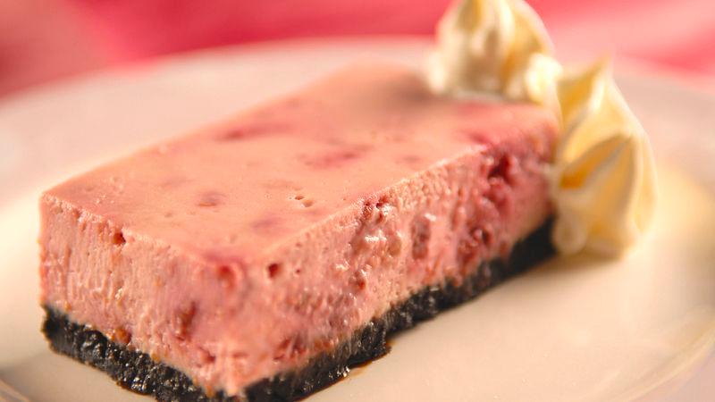 - Bake for 55 to 60 minutes, until the sides of cheesecake are set and the middle has a slight wiggle. Cool in pan (in water bath) on cooling rack 20 minutes. Remove from water bath. Run metal spatula around edge of pan. Cool on cooling rack 30 minutes. 3 to 4 hours. For perfectly sliced bars, place the cheesecake in freezer, tightly covered in plastic, for about one hour prior to cutting. For best presentation, carefully wipe knife clean often while cutting slices. Serve chilled with fresh raspberries and mint springs.