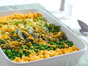 - In a large rectangular glass or ceramic serving dish, line up one half of the macaroni mixture along the left short side. Working left to right, add celery, melon, onions, spinach, asparagus, and peas in "stripes." Finish with a stripe of the remaining macaroni along the right side.