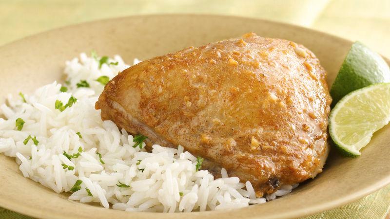 - Heat oven to 375°F. Place chicken and marinade in ungreased roasting pan. Bake 55 to 60 minutes, basting chicken with melted butter several times, until juice of chicken is clear when thickest pieces are cut to bone (165°F). Serve with lime wedges.