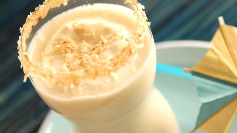 - Place all the ingredients except toasted coconut in a blender. Cover and blend on high until smooth. Serve immediately.