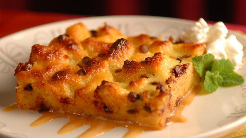 - Spread mixture in a greased 11x7-inch (2-quart) glass baking dish. Bake at 350°F for 40 to 45 minutes or until golden. Serve warm, garnished with caramel sauce and whipped cream.