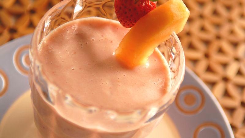 - Place all ingredients except additional fruit in blender. Cover and blend on medium until smooth. Pour into tall glasses. Garnish with additional fruit. Serve immediately.