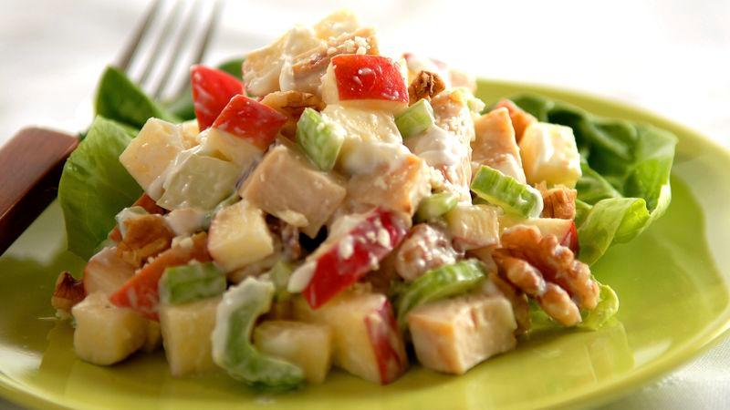 - In a large bowl, mix chicken, apples, celery, and walnuts. Set aside.