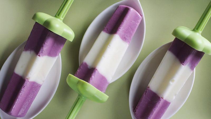 - Divide the remaining grape yoghurt mixture between the pops, spreading it over the partially frozen white layer in the pop molds. Insert sticks into centers of pops and freeze overnight. Remove pops from molds to serve.